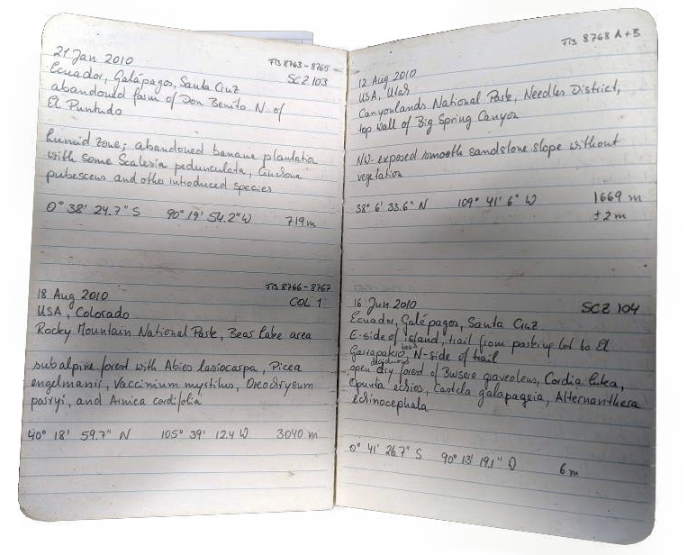 The field book: the detailed locality information corresponds to Location ID (e.g., SCZ 103 for collection site #103 on Santa Cruz Island, Galapagos). For more efficient collecting, collection bags are then labeled only with the corresponding Date and Location ID.