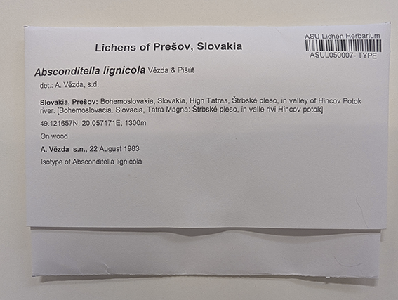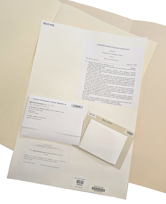 Flat specimen storage of the Isotype specimen of Agonimia koreana in the ASU Lichen Herbarium (for an explanation of the different identifiers, refer to the section below on Keeping track of specimens.