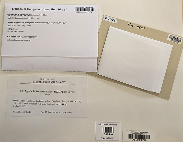 The ASU isotype of Agonimia koreana was collected by K.H. Moon with collector number 10040 and then distributed by H. Kashiwadani & K.H. Moon as Lichenes Minus Cogniti Exsiccati #351.