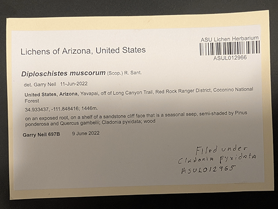 Cross Reference Card: Diploschistes muscorum is a lichen starting its thallus development as a parasite on Cladonia species and bryophytes. To manage both species records of the host and its parasite in the ASU database, each one gets a the same collection number assigned, but A and B are appended, each record accessioned into the herbarium under its own catalog number (= different barcodes). The specimen is then filed under the species identification of the first record, here Cladonia pyxidata (ASUL012965), whereas a cross reference card for the second record under its species name, here Diploschistes muscorum (ASUL012966). Both occurrence records can thus easily be found in the database as well as their corresponding specimens on the shelves in the herbarium.
