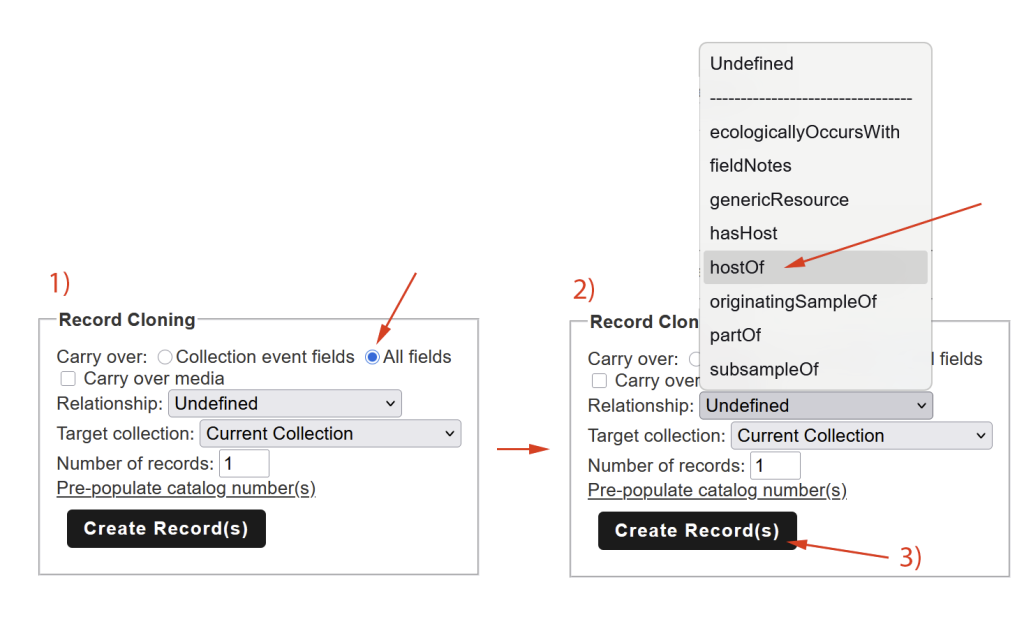 Cloning Records in the Occurrence Editor: (1) select to carry over all fields, (2) define the relationship of the new record to the existing one (for example: the new record is a lichenicolous fungus for which the current record is the host lichen; typically you would create a cloned record in the same collection you are working on, but you could also create a duplicate to be transferred into a different collection to which you have access), (3) create the cloned record, and (4) make sure that the record numbers (= collector numbers) are unique and each specimen gets its own catalog number (= barcode).