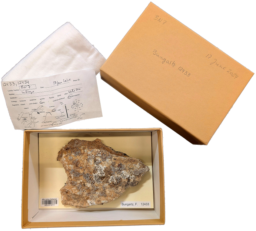 Large, bulky rock specimens are better stored in archival carton boxes. Using boxes, ideally with some padding, is also recommended for specimens that may be particularly brittle (e.g., soil crusts). To accommodate bulky specimens of different size use custom made boxes of different depth with a length and width matching that of regular herbarium envelopes. This way these specimen boxes need not to be filed separately from the main collection (see storage).