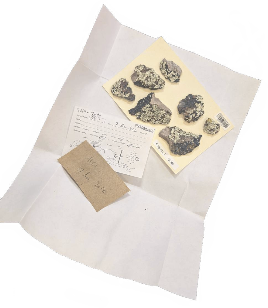 Lichens are typically stored in standard herbarium “envelopes” folded from regular sized paper (A4 or letter). The advantage of these packages is that by unfolding these “envelopes” specimens can be taken out of their packet without damage. Regular envelopes or paper bags are not ideal, because by sliding specimens in and out repeatedly the specimen surface with its lichen specimen will rub against the paper and, especially brittle specimens may thus break apart.