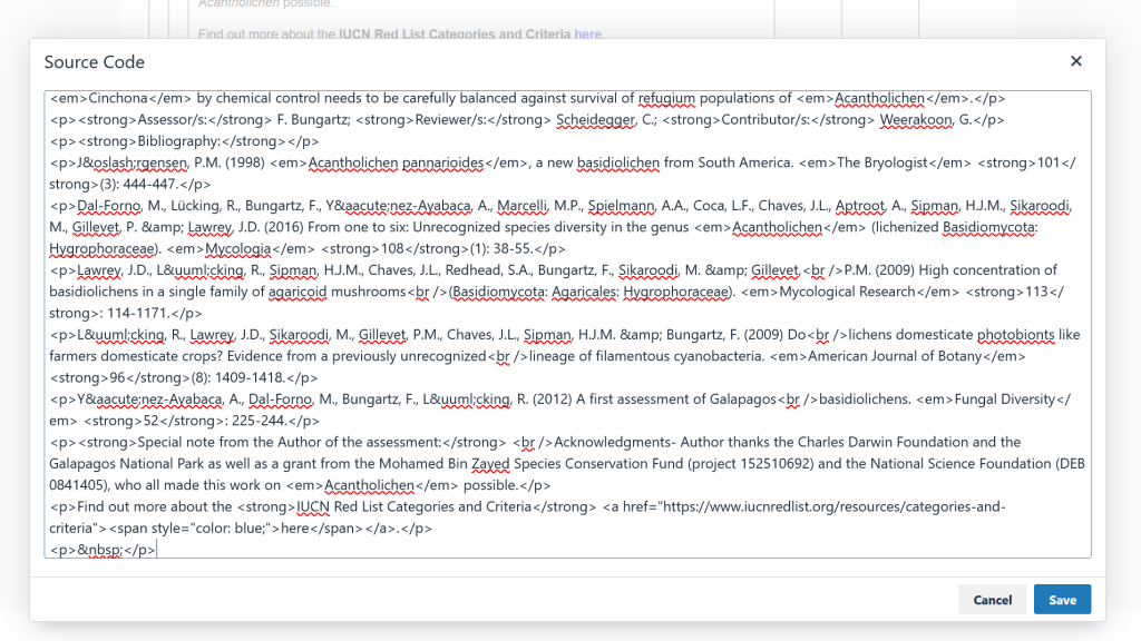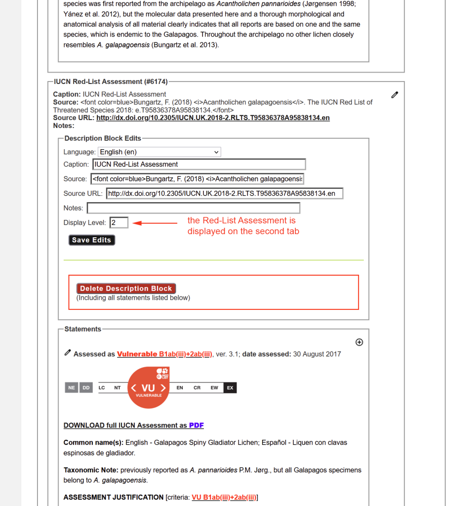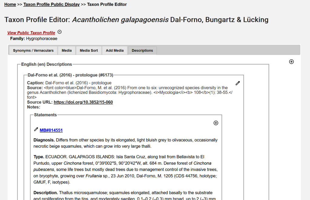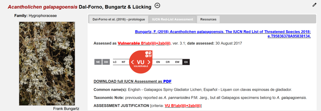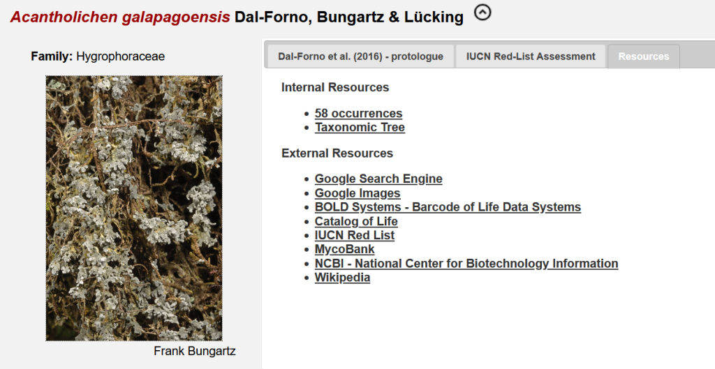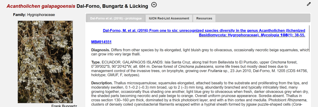 Here is an example of the taxon profile of Acantholichen galapagoensis, an IUCN red-listed species; the first tab displays the original description with a link to the reference where the species was published and its Mycobank number:
