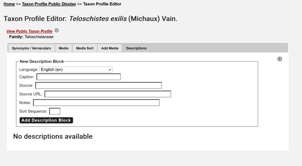 The Description tab in the Taxon profile Editor can be used to add a description to a Taxon Profile. It is possible to add several different descriptions.