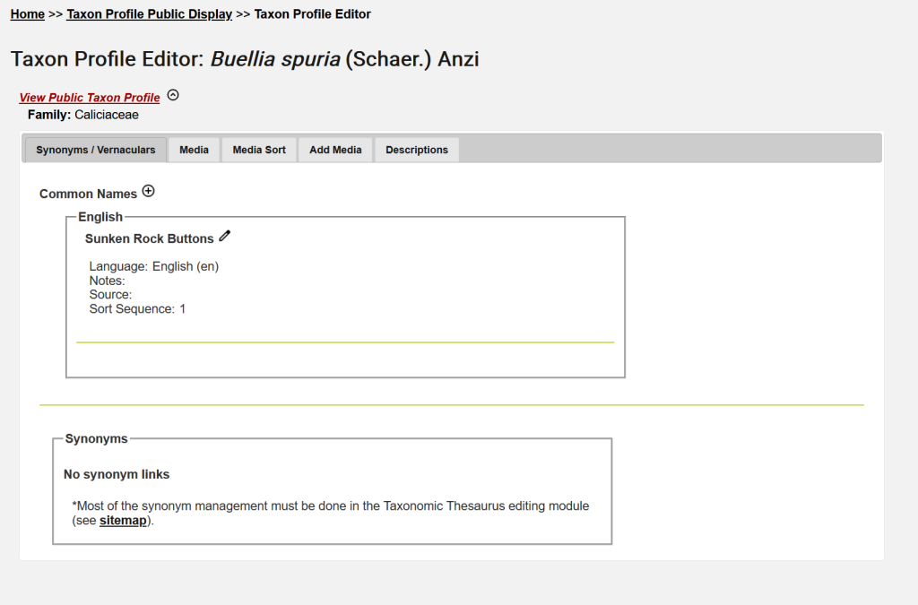 On the first tab you can add common names (vernaculars); there is also a link here to the Sitemap, from which users can access and update the Taxonomic Thesaurus (direct edits here are not possible.