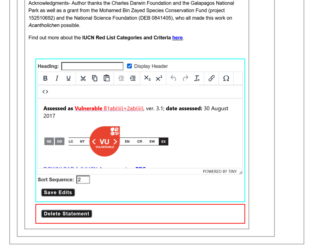 For taxa like Acantholichen galapagoensis, the descriptions are shown according to their sort order (= Display Level); the description block shown on the first tab is displayed first, then the next, the Resources tab is per default always the last tab displayed.