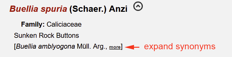 For example, for Lecanora albellula the new combination Lecanoropsis albellula was recently introduced and as a consequence the taxonomic thesaurus of the Consortium updated to reflect that Lecanoropsis albellula is now considered the accepted name, Lecanora albellula considered a synonym. Images of specimens identified as Lecanora albellula will now be displayed in the taxon profile of Lecanoropsis albellula. - Identifications frequently also change because the original identification was incorrect.