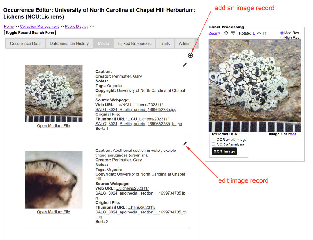 Any user with access to a collection can add images to specimens, using the Media tab in the Occurrence Editor: