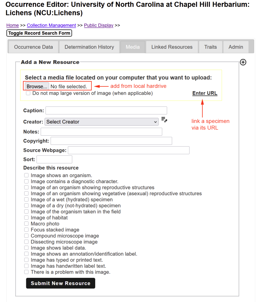 If you are an editor for a particular collection, go to the Occurrence Editor, search for the specimen record, select the Media tab and use the “plus” icon to upload an image. Images can either be uploaded from your local harddrive, or linked from another website via the image URL. Manually uploading images, you can add a caption, select the photographer who created the image, add notes and a copyright statement, ad a sort order, and tag the image:
