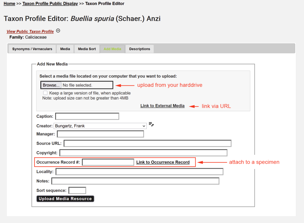 Uploading images directly to the Taxon Profile is limited to a small group of contributors, expert lichenologists who can generally be trusted to upload images that are correctly identified. Still, these images remain problematic. A photo typically does not display all aspects of a lichen necessary for identification.